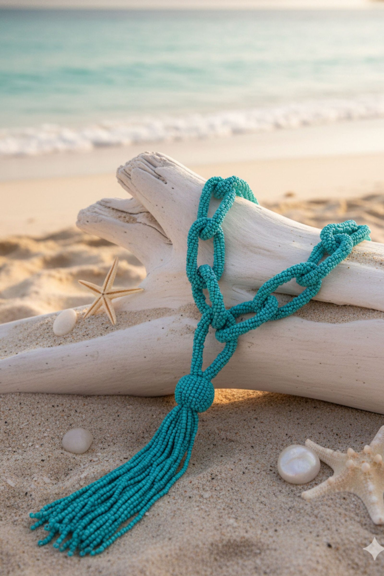 The versatility of the Turquoise necklace makes it a favorite for stylists across the globe. For a quintessential boho-chic appearance—as seen on our model in the breezy beach setting—pair the necklace with a flowing cream kaftan or a white crochet crop top. The contrast between the neutral fabric and the vibrant beads creates a striking, vacation-ready look.