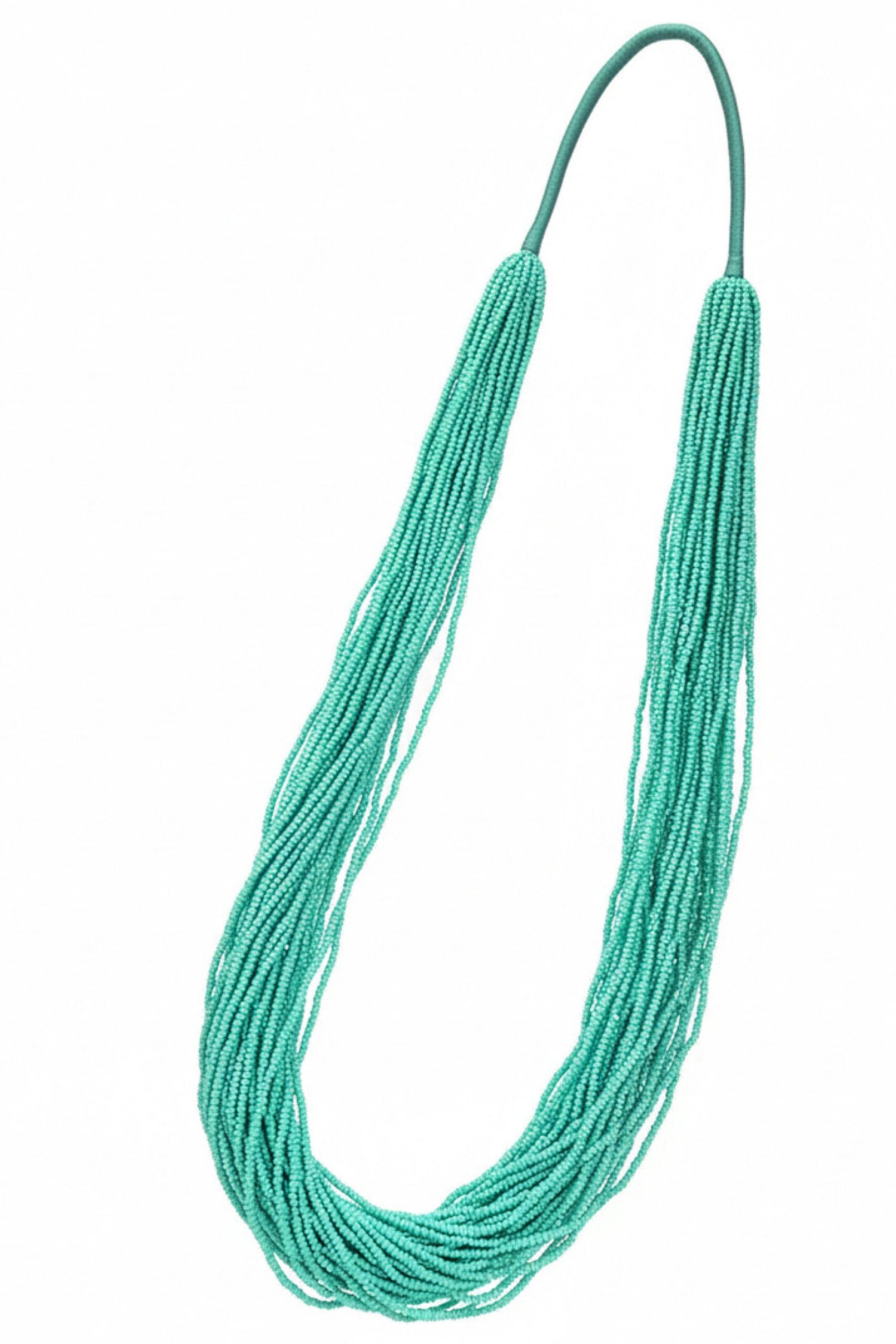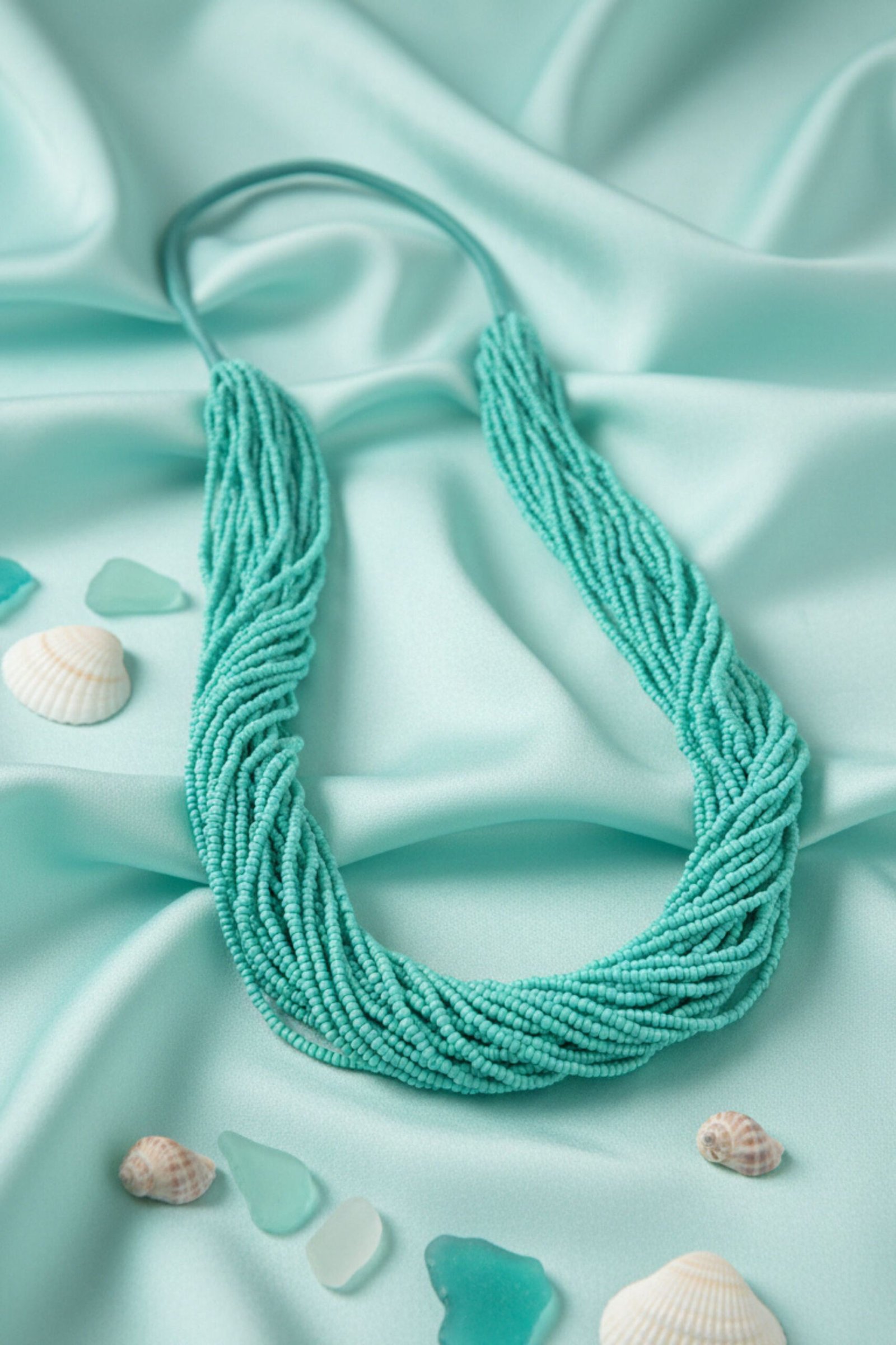 This stunning necklace is a celebration of artisanal craftsmanship. It features dozens of delicate strands, each meticulously strung with high-quality seed beads that mimic the natural variations of genuine turquoise stone. The result is a rich, textured drape that offers a refreshing pop of blue color against any outfit. As a staple piece of jewellery, it embodies the free-spirited essence of boho style while maintaining a polished finish suitable for modern fashion trends.