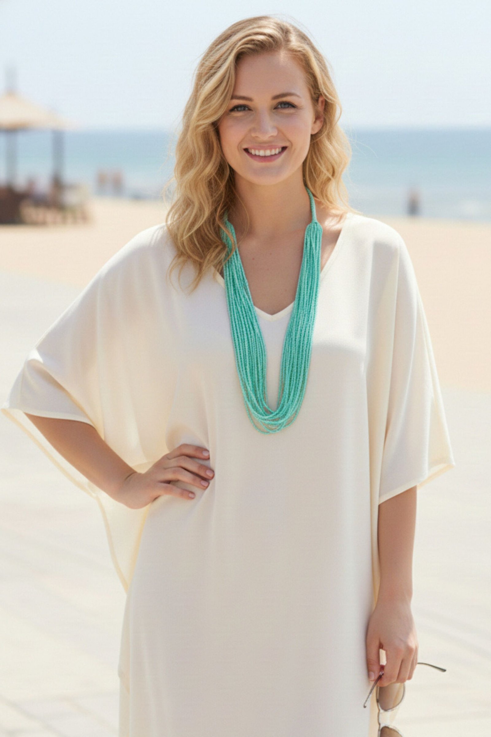 The versatility of this Turquoise necklace makes it a favorite for stylists and fashion enthusiasts alike. For a classic boho-chic look, as styled on our model, pair the necklace with a flowing cream kaftan or a white linen maxi dress. The contrast between the neutral fabric and the vibrant green-tinged blue beads creates a striking, vacation-ready ensemble.